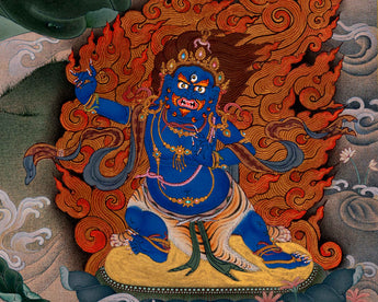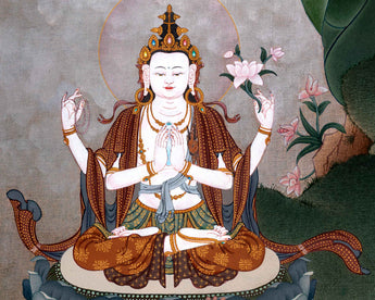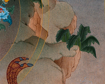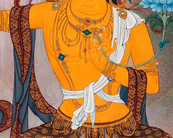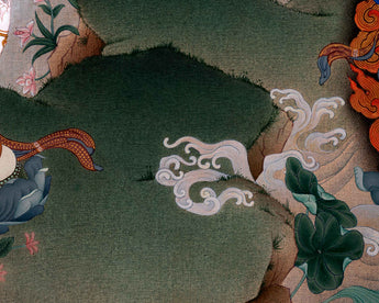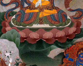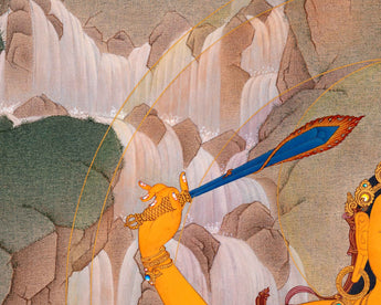 The Thangka depicting Manjushri with Chenrezig and Vajrapani is a profound embodiment of wisdom, compassion, and spiritual strength. Hand-painted with meticulous detail on a canvas woven from pure cotton, this sacred artwork showcases these revered Bodhisattvas in exquisite form. The use of natural stone colors imparts an earthy and grounding palette, elevating the spiritual significance of the composition. Accentuated with genuine 24K gold, the Thangka shimmers with an ethereal radiance, symbolizing the transcendental blessings and enlightenment that these divine figures embody. Manjushri, the Bodhisattva of Wisdom, Chenrezig, the Bodhisattva of Compassion, and Vajrapani, the Bodhisattva of Strength, together form a divine trinity that guides and inspires seekers on their spiritual journey. As a masterpiece of both artistic and spiritual merit, this Thangka serves as a conduit, inviting us to connect with the profound energies of wisdom, compassion, and inner strength, thereby nurturing our own spiritual growth and transformation.