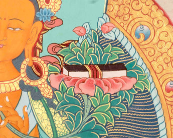 In a thangka painting, Manjushri is shown as a young man holding a lotus blossom in his left hand to indicate his purity and compassion and a sword in his right hand to represent his capacity to cut through ignorance and delusion. He is frequently portrayed riding on a lion, which stands for courage and sturdiness.