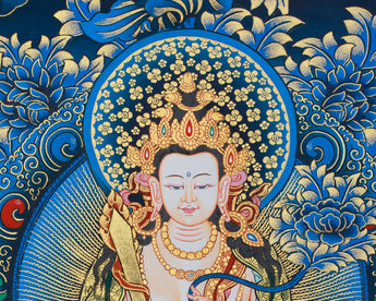 This Thangka of Bodhisattva Manjushri depicts the Wisdom Deity, recognized for his awakened intellect and profound perception. He represents his deep understanding and role in assisting practitioners on their journey to enlightenment with his serene posture and peaceful, caring visage. He is adorned with intricate robes, richly detailed with golden patterns, highlighting his divine nature. A magnificent crown adorned with jewels sits atop his hair, signifying his superior position. Above a stunning blue background, he sits upon a lotus base, representing purity, signifying his all-pervading wisdom. It is carefully painted on cotton canvas in the traditional Tibetan style. Its beauty and spiritual importance are enhanced by the use of real 24K gold and acrylic colors.