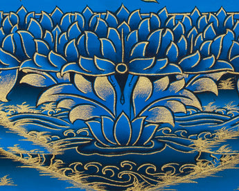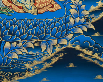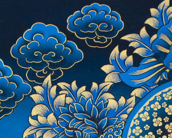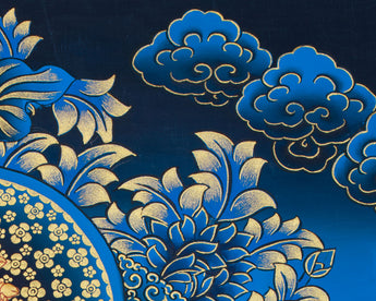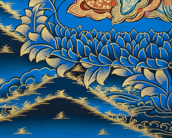 One of the most significant components of this thangka is the sword of wisdom that Manjushri holds. By slicing through the veils of misunderstanding and illuminating the way to the ultimate truth, the sword symbolizes his capacity to cut through ignorance, delusion, and attachments. The sword's blade shines with golden accents, indicating its strength and ability to cut through any barrier to wisdom. The handle of the sword is ornate, matching the richness of the golden robes and the floral motifs that embellish his throne and the surrounding clouds. The gold detailing in the blue backdrop gives the thangka an auspicious atmosphere, especially in the form of swirling clouds and lotus petals, which heightens the feeling of sacred space and the enlightened spirit of the Bodhisattva.