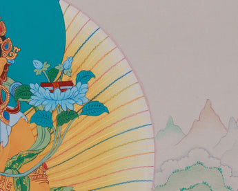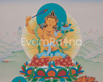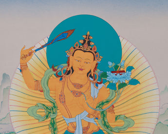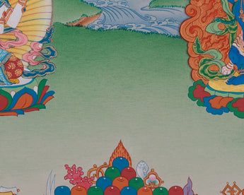 In the center, Manjushri, the Bodhisattva of Wisdom, wields a fiery sword to cut through ignorance while clutching a sacred scripture as a symbol of knowledge. Avalokiteshvara, the Bodhisattva of Compassion, is seen sitting with a wish-fulfilling jewel and a lotus, exuding kindness and love beyond boundaries. With a vajra, Vajrapani, the Bodhisattva of Enlightened Action, is depicted, representing strength and resolve to conquer challenges. Their tranquil expressions and rich details of divine attributes make this thangka a significant addition to sacred collections and meditation areas, encouraging spiritual development and connection.