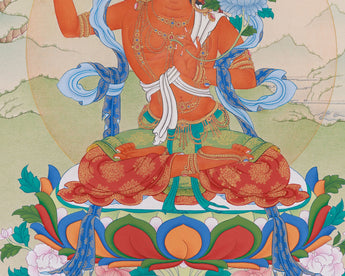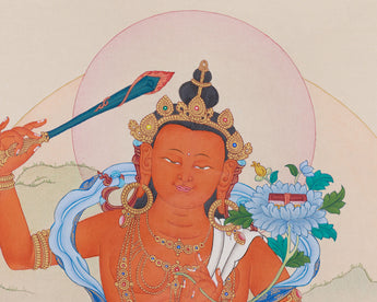 This Flaming Sword Holder Manjushri Thangka is a significant and captivating piece of art, meticulously hand-painted on cotton canvas using natural, mineral-based pigments and enriched with authentic 24K gold. The employment of natural minerals such as lapis lazuli, malachite, and cinnabar imparts the artwork with profound, vibrant coloration. Simultaneously, the gold accents emanate a divine radiance, encapsulating the spiritual essence of Manjushri, the Bodhisattva of Wisdom. Executed in the traditional Karma Gadri style, known for detailed intricacy and vivid colors, the thangka exudes timeless vitality, encouraging meditation on the Buddha's wisdom and compassion.