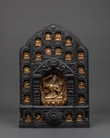 At the center, the seated Manjushri is adorned in a golden hue, holding a sword of wisdom and a scripture. Numerous small depictions of deities surround the figure, each symbolizing different aspects of Buddhist teachings. The ornate frame is crafted from wood, with carefully designed carvings that complement the serene image of Manjushri, adding a layer of spiritual significance and elegance to the altar.