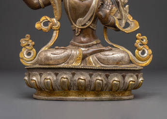 Handcrafted from copper and beautifully gilded with gold, this statue radiates beauty and spiritual depth. Every detail, from the ornate crown to the elegant robes, reflects Manjushri's relationship to enlightened understanding. The symbolic symbols on the lotus base and throne backrest emphasize the fundamental importance of wisdom and mental clarity. The gold-plated finish casts a subtle glow, reflecting the light of knowledge and adding to the spiritual mood of your environment.