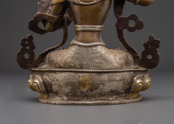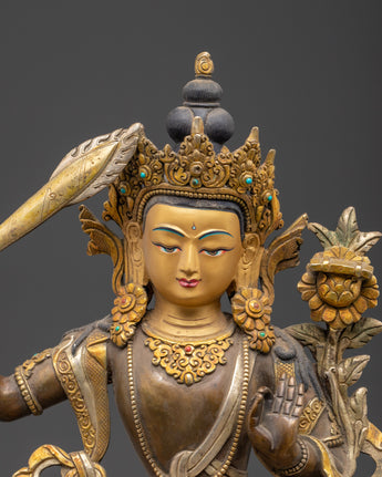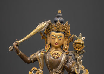 This handcrafted Tibetan Manjushri Statue perfectly captures the idea of boundless wisdom and enlightenment. Manjushri, the Bodhisattva of Wisdom, is represented with a blazing sword in his right hand, indicating the removal of ignorance and illusion. In his left palm, he gently cradles a blossoming lotus and the sacred literature of Prajnaparamita, which represents perfect wisdom. This statue's calm yet imposing presence will boost the energy of any altar, meditation room, or holy space, encouraging mental clarity, insight, and spiritual enlightenment.