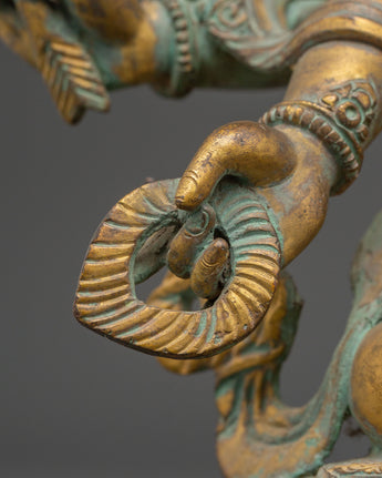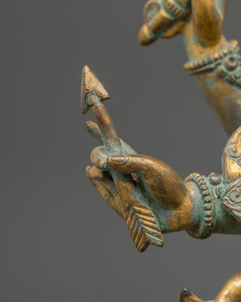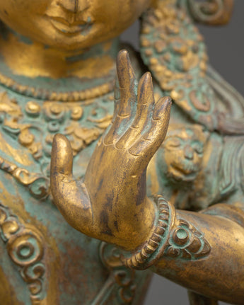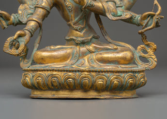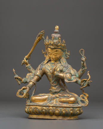 This exquisite Handmade Statue of Maha Manjushri captures the profound essence of wisdom and clarity, revered deeply in Tibetan Buddhism. Crafted from a copper body and enriched with gold plating, this 35-year-old sculpture showcases the powerful form of Manjushri, the Bodhisattva of Wisdom. With multiple arms holding sacred implements like the flaming sword and lotus, the statue symbolizes the dispelling of ignorance and the flourishing of knowledge.