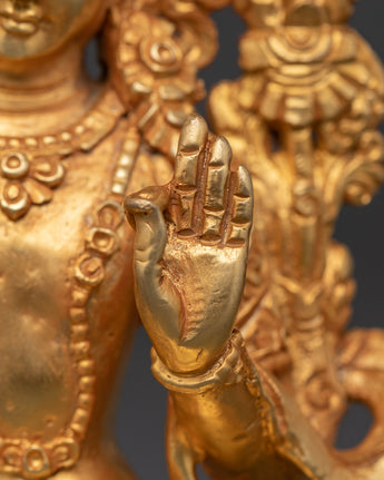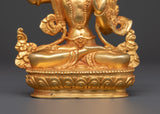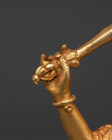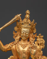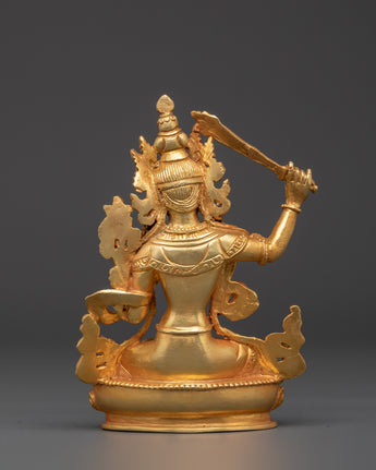 This exquisite statue of Manjushri, the guardian of enlightened wisdom, exemplifies the fine Tibetan artistry. Crafted from copper and elegantly gold-plated, the statue captures Manjushri holding his iconic sword, symbolizing the cutting through of delusions and ignorance. Standing at 14.5 cm tall and 10.5 cm wide, this finely detailed piece embodies both spiritual significance and artistic mastery. Ideal for meditation spaces or as a meaningful collectible, it serves as a powerful reminder of mindfulness, clarity, and the pursuit of wisdom in daily life.