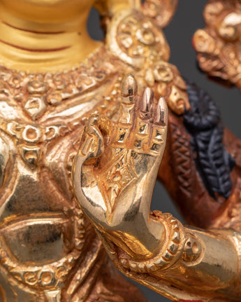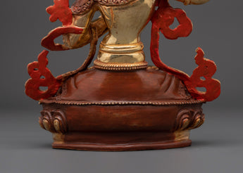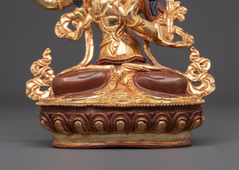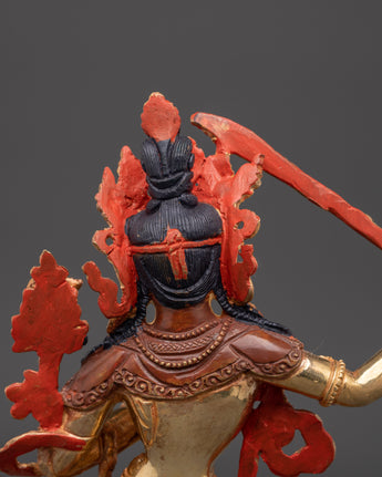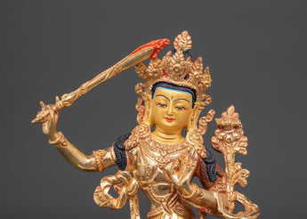 This statue is a sacred artifact in Buddhist practice, possessing both spiritual importance and aesthetic appeal. Its craftsmanship reveals complex intricacies, and gold plating adds a regal touch to the statue's physical appearance. The fiery sword represents the sharpness of wisdom that clears misunderstanding, whilst the sacred sutra highlights the necessity of wisdom in achieving enlightenment. Whether displayed in a meditation room, home shrine, or study area, this statue serves as a reminder to seek clarity and enhance one's understanding. It is ideal for people looking to expand their intellectual development, spiritual practice, and comprehension of Buddhist teachings.