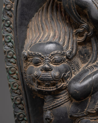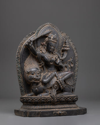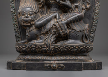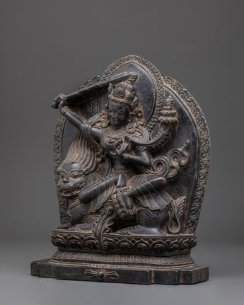 The sculpture depicts Simhanada Manjushri in a dynamic position, wielding a fiery sword that cuts through confusion and delusion. The figure is richly detailed, wearing a crown, jewelry, and layered robes, and accompanied by a terrifying lion, symbolizing wisdom's strong presence. A masterfully carved aureole of flames and symbolic motifs adorns the figure, inspired by traditional Himalayan Buddhist iconography. Every detail, from the piercing focus to the flowing textures, shows a profound spiritual aim and regard.