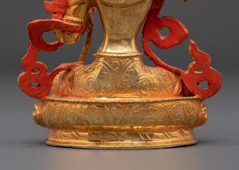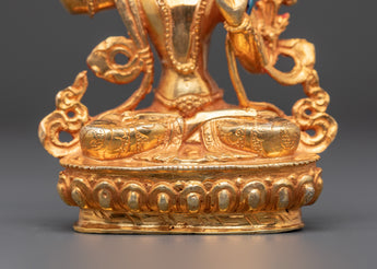 This gold-plated copper Manjushri statue highlights exceptional craftsmanship, capturing the Bodhisattva’s serene expression, elegant seated posture, and symbolic attributes. Known as the guardian of wisdom, Manjushri is invoked by practitioners to dispel ignorance, sharpen intellect, and guide them toward higher understanding. Its radiant finish makes this statue a powerful centerpiece for Buddhist altars, meditation rooms, or sacred collections of Himalayan art.