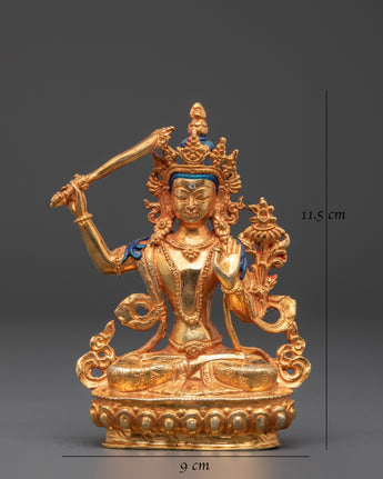 The Tibetan Buddhist Manjushri Statue represents the Bodhisattva of Wisdom, revered across Mahayana and Vajrayana traditions as the embodiment of enlightened knowledge. This exquisite piece measures 11.5cm in height and 9cm in width, with a weight of 0.37kg, and is crafted from copper with gold plating. Manjushri, often depicted holding the flaming sword of wisdom and the lotus supporting the book of transcendent knowledge, is a symbol of clarity, learning, and insight.