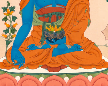 Transform your meditation corner or living space with this sacred artwork, which is not only visually captivating but also imbued with spiritual significance. Traditionally, practitioners have employed the Medicine Buddha Thangka to support their visualization techniques and facilitate a deeper connection with the Buddha's healing powers and compassion. This Thangka print is an effective tool for improving spiritual wellness and inner calm, regardless of your experience with Buddhist art. Whether used for personal purposes or as a considerate present for close ones, our Lapis Lazuli Medicine Buddha Thangka Print infuses any space with a sense of divine healing and peace. Place your order right away to welcome the Medicine Buddha's blessings into your house.
