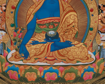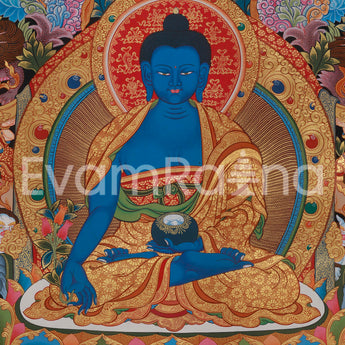 This Bhaishajyaguru print is a high-quality giclée reproduction on cotton canvas, portraying the Medicine Buddha on a lotus throne, which symbolizes his role as a divine healer. The print includes illustrations of the six perfections (paramitas), representing enlightened qualities such as generosity, morality, patience, diligence, concentration, and wisdom.
