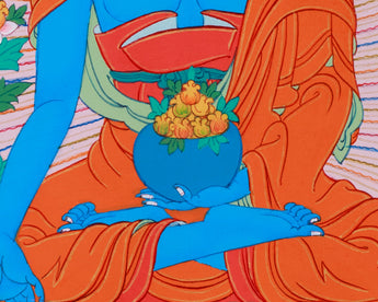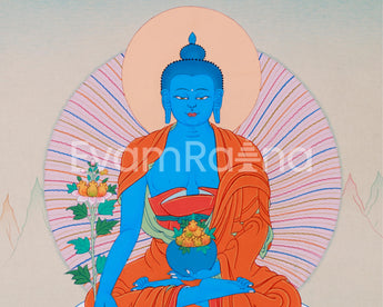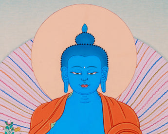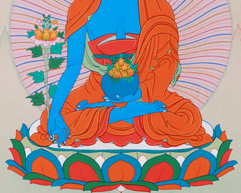 This hand-painted Thangka will bring the presence of Bhaisajyaguru, the Healing Lapis Lazuli Buddha, into your space. Created on canvas using vibrant acrylic colors, this piece exudes a sense of calm and spiritual power. The luminous blues, inspired by the sacred Lapis Lazuli gemstone, represent the Buddha's divine wisdom and ability to alleviate suffering and illness. With his Lapis Lazuli blue body, symbolizing purity and healing energy, this Thangka follows the traditional Tibetan artistic style to inspire serenity and devotion. Crafted with precision and care, it is an ideal centerpiece for meditation, prayer spaces, or as a sacred gift.