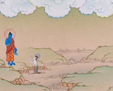 This thangka holds special significance because of its combined lower scene, where the Medicine Buddha blesses a Nagkanya, a mythical creature that is part serpent and part human. Its cohesive design links the celestial and earthly worlds, serving as a powerful symbol of the Buddha's compassion for all beings. This painting is a sacred meditation object and a collectible Himalayan artwork, ideal for healing rooms, shrines, or spiritual collectors who value meaning, rarity, and beauty.