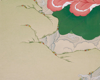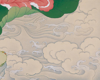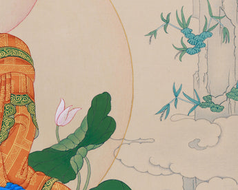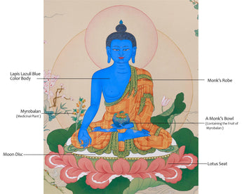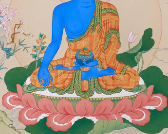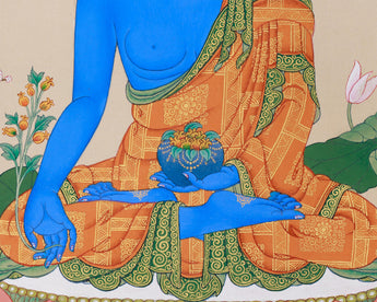 Considered the Master of Healing in Mahayana and Vajrayana traditions, Bhaisajyaguru, also known as the Medicine Buddha, is deeply revered. He's believed to heal physical illnesses, purify negative karma, and bring about longevity and inner peace. The deep blue color of his body represents the healing power of lapis lazuli, exuding serenity and boundless compassion. In this thangka, Bhaisajyaguru is shown holding a medicine bowl filled with healing nectar. His right hand, however, has a myrobalan, symbolizing the transformative and healing power of his teachings. Each stroke of color and gold accentuates his role as a divine physician, offering both physical and spiritual healing to those who reverence his image.