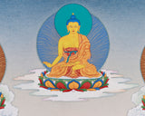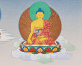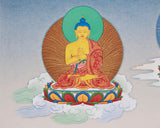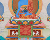 Alongside him, the other seven Healing Buddhas—each linked to different aspects of health and well-being—are named Suvarna Bhadra Vimala, Supari Kiritita Nama Sri Raja, Svaraghosa Raja, Dharmakirti Sagara Ghosa, Asokottama Shri, Shakyamuni Buddha, and Abhijna Raja. Every Buddha is carefully depicted with their distinctive colors, postures, and symbols, representing various aspects of holistic understanding of health. The Karma Gadri style showcases divine wisdom and compassion in every figure, with a focus on their clothing, expressions, and symbolic objects. This thangka is more than a beautiful piece of art; it is a sacred object that fosters a deep spiritual connection with the healing wisdom of the Tibetan Eight Medicine Buddhas—bringing protection and well-being into your space.