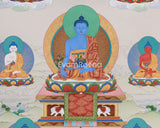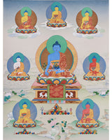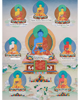 The Tibetan Eight Medicines Buddha is a revered and ancient symbol of healing, with each Buddha representing the power to mend physical, mental, and spiritual struggles. At the heart of this thangka, the Medicine Buddha, known as Bhaisajyaguru, is shown in a glowing, radiant form, holding a vessel of healing nectar and surrounded by the universe's healing energies. His presence serves as a comforting source of healing for illness and suffering, providing hope and reassurance.