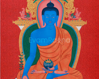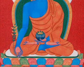 It follows the Kadampa style, a traditional Tibetan Buddhist artistic approach known for its precision and sacred iconography. The Medicine Buddha is depicted with a lapis lazuli blue body, symbolizing his infinite healing powers. His monk's robe signifies his renunciation of worldly attachments and dedication to spiritual enlightenment. The myrobalan fruit in his bowl represents a powerful medicinal plant, demonstrating the Buddha's ability to heal both body and soul. The lotus seat symbolizes purity and spiritual elevation, while the moon disc beneath his seat represents serenity and enlightenment. The radiant glow of 24K gold highlights sacred elements, making the thangka a beacon of healing and spiritual connection. Each aspect is carefully designed to inspire inner peace and the path to enlightenment, making it an ideal addition to any home or spiritual space.