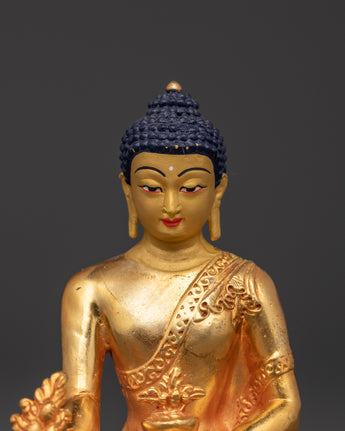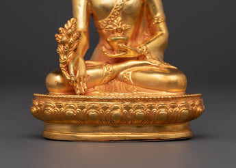 This statue's workmanship exemplifies exceptional creativity, with each detail deliberately intended to highlight the Medicine Buddha's beauty and heavenly grace. The gold plating gives the statue a brilliant sheen that not only emphasizes its spiritual value but also offers an air of elegance and calm to any setting. Place this statue in your house to provide healing energy, protection, and the Buddha's blessings of health and peace.