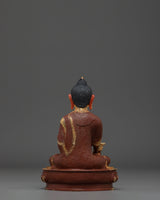 Medicine Buddha, the Supreme Healer, is depicted in padmāsana (lotus posture), radiating a serene presence. His right hand holds a myrobalan plant, symbolizing the healing of both physical and spiritual ailments. In his left hand rests an alms bowl filled with nectar, representing the medicine of immortality and ultimate liberation from suffering. His crowned ushnisha embodies supreme wisdom, while the lotus base signifies purity and enlightenment arising unstained from the world. Together, these attributes highlight Medicine Buddha’s role as the divine healer and compassionate protector of all beings.