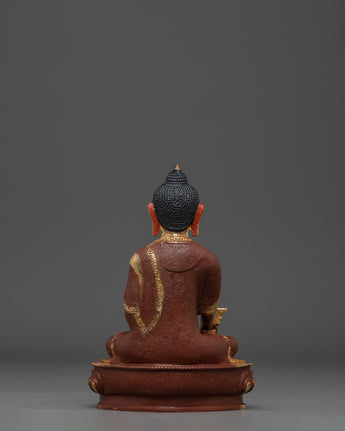 This golden Buddhist healing Buddha, Bhaisajyaguru statue, stands at 8.1”/20.5cm in height and 5.5”/14cm at the base, weighing 1.27 kg. Made from copper and adorned with 24K gold gilding, gold and acrylic paintings, it reflects traditional craftsmanship and spiritual symbolism. Expertly crafted by skilled Nepali artisans, it makes a meaningful addition to altars, meditation spaces, or personal collections focused on health, well-being, and inner peace.