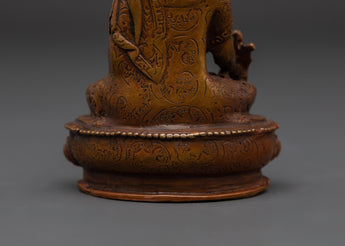 Our Healing Guru Medicine Buddha embraces the potential of spiritual healing. In Tibetan Buddhism, Buddha statues are regarded for their ability to alleviate suffering and bring about inner equilibrium. This statue, which is 10 cm tall and 6.5 cm wide and weighs 0.24 kg, is handcrafted from oxidized copper and is ideal for personal altars, meditation areas, or as a wellness token present. Medicine Buddha, also known as Bhaisajyaguru, provides a road to holistic well-being and is revered for his capacity to cure mental, emotional, and spiritual ailments.