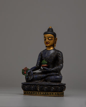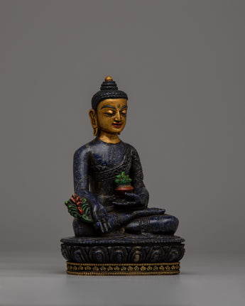 Medicine Buddha, also known as Bhaishajyaguru in Sanskrit, is regarded as the Buddha of Healing. His teachings aim to free sentient beings from sickness, pain, anguish, and unhappiness while emphasizing the need for prosperity and enjoyment in this life. Many meditators in the Mahayana tradition admire his healing abilities. He is frequently shown with a blue (lapis lazuli) body and hands carrying a begging bowl and medical herbs.