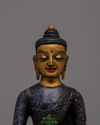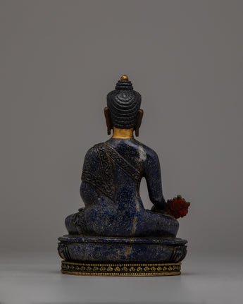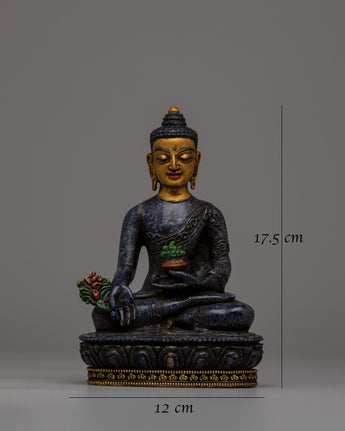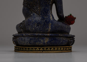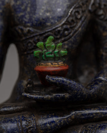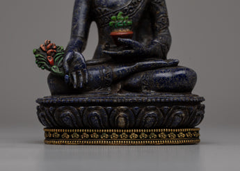The Lapis Buddha Statue, carved from a single block of lapis lazuli stone, is evidence of the Buddhist artists' exceptional craftsmanship and spiritual regard. The Buddha's countenance is carefully crafted, capturing each detail of compassion and tranquility. The statue gains a touch of divine radiance from the 24k gold face painting, which highlights the serene expression that captures the spirit of the Medicine Buddha.