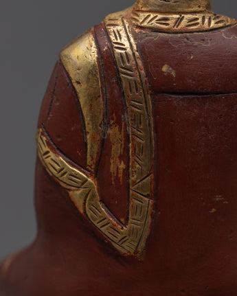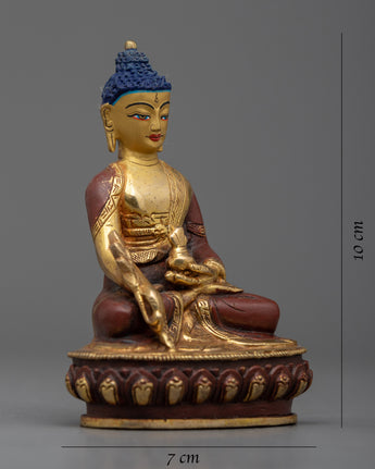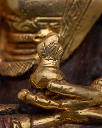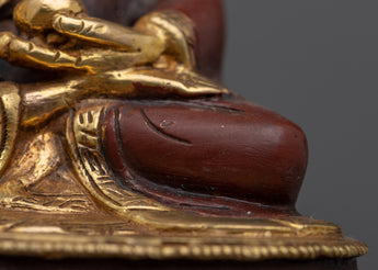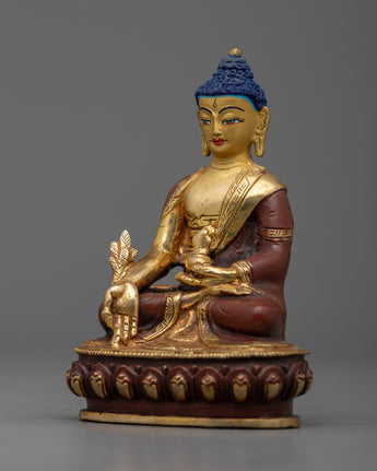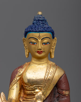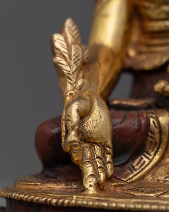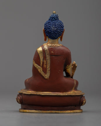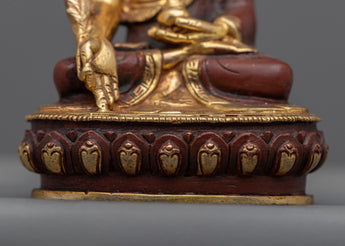 Take advantage of the therapeutic energy coming from the Medicine Bhaisajyaguru Buddha Statue, a divine work of art with a copper body and stunning 24k gold gilding. This statue exudes a calm, restoring aura and is a representation of both physical and spiritual health.