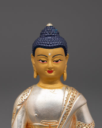 This silver-plated medicine Buddha Statue is a sacred symbol of healing, compassion, and enlightenment. Crafted from a copper body with a radiant finish of silver and gold plating, this statue beautifully represents the Medicine Buddha, known in Buddhist tradition as the supreme healer. With a height of 10.5cm, a width of 7.5cm, and a weight of 0.23kg, it is ideally suited for meditation altars, home shrines, or other spiritual spaces.