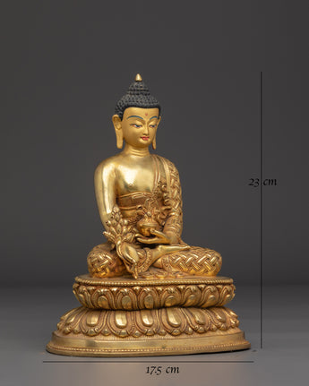 The Medicine Buddha Statue is a remarkable piece crafted to inspire healing, tranquility, and spiritual well-being. Measuring 23cm tall and 17.5cm wide, it is perfectly sized to grace your altar, meditation corner, or any sacred space within your home. Made from copper, this statue is elegantly gilded with gold and enhanced by intricate acrylic paintings that highlight the Buddha’s serene expression and intricate details. As a symbol of healing energy and compassion, the Medicine Buddha brings a powerful spiritual presence to your practice or decor. The gold-gilded finish not only adds a touch of luxury but also evokes a sense of calm and reverence. The copper base symbolizes the vital connection between earth and spirit, grounding the statue’s healing energy in your environment.