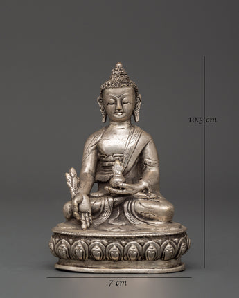 This handcrafted Tibetan Medicine Buddha Statue from Nepal, made of silver-plated copper, can bring healing energy and spiritual serenity into your area. This sacred figure, representing the Healing Deity of Tibetan Buddhism, is depicted in a tranquil meditation stance, reclining gracefully on a lotus moon disc, which symbolizes spiritual awakening and purity. The statue, measuring 10.5 cm in height and 7 cm in width, depicts the varada mudra (gesture of compassion and offering) with the right hand. In contrast, the left hand tenderly holds a rice pot, symbolizing food, healing, and longevity.