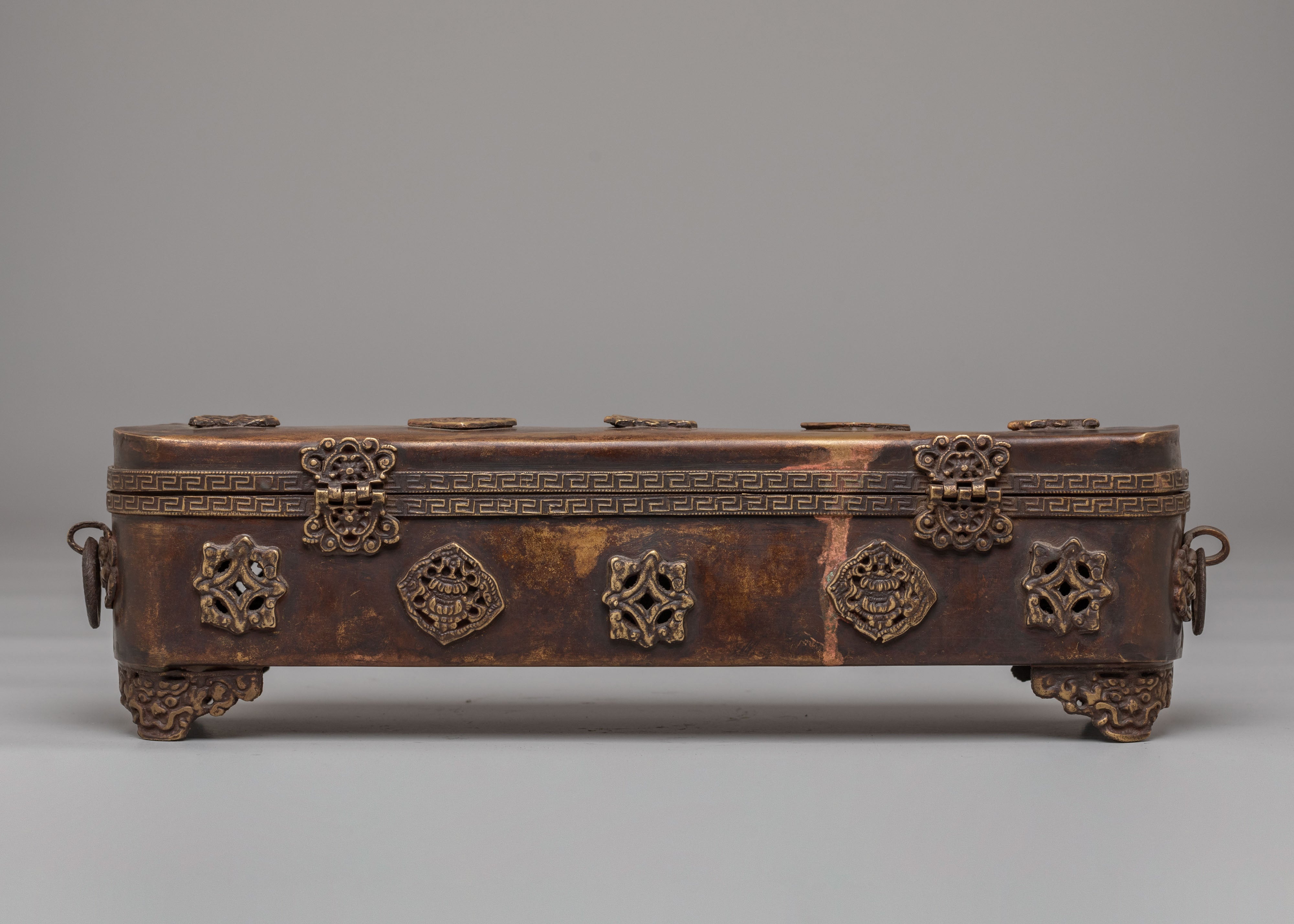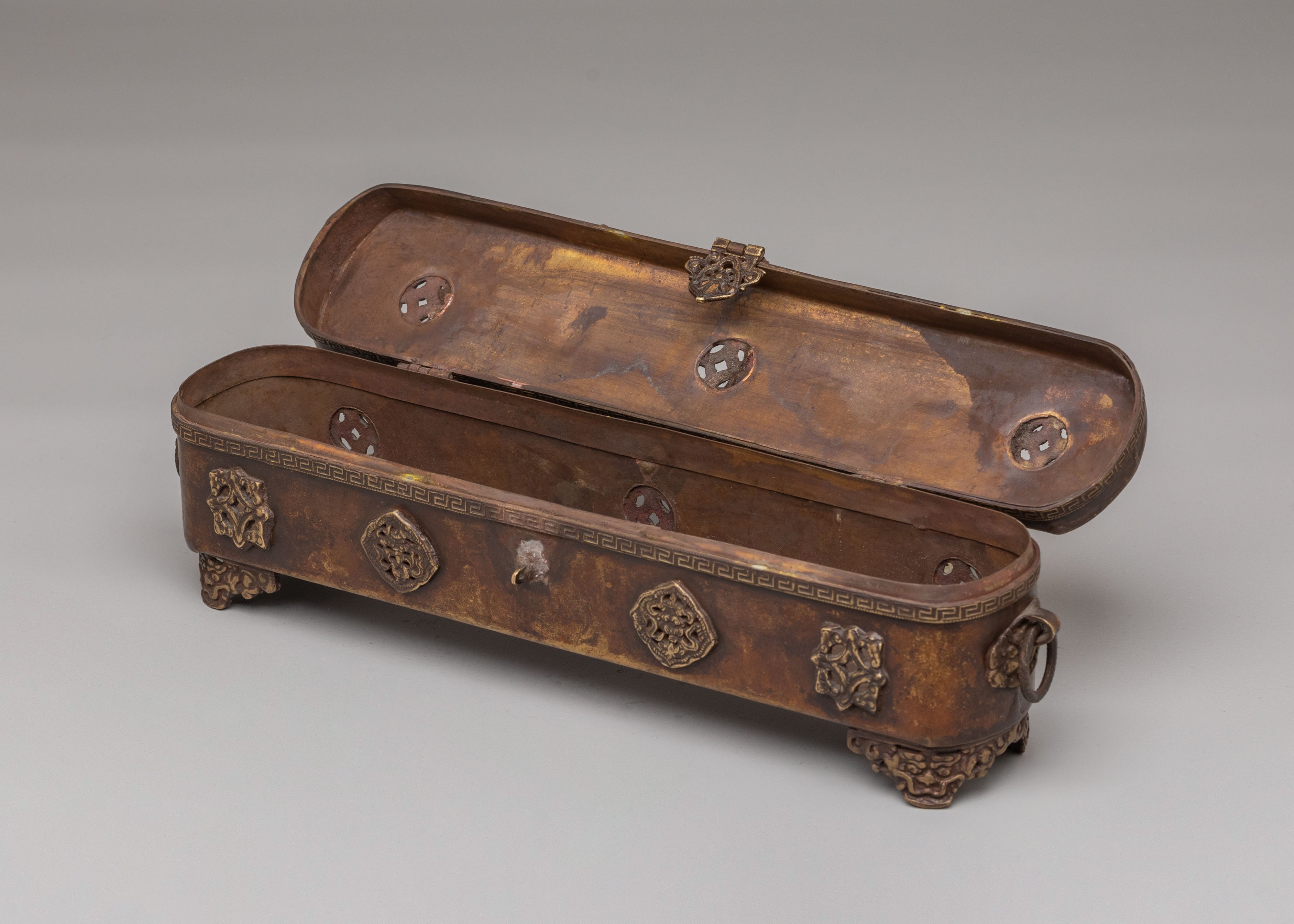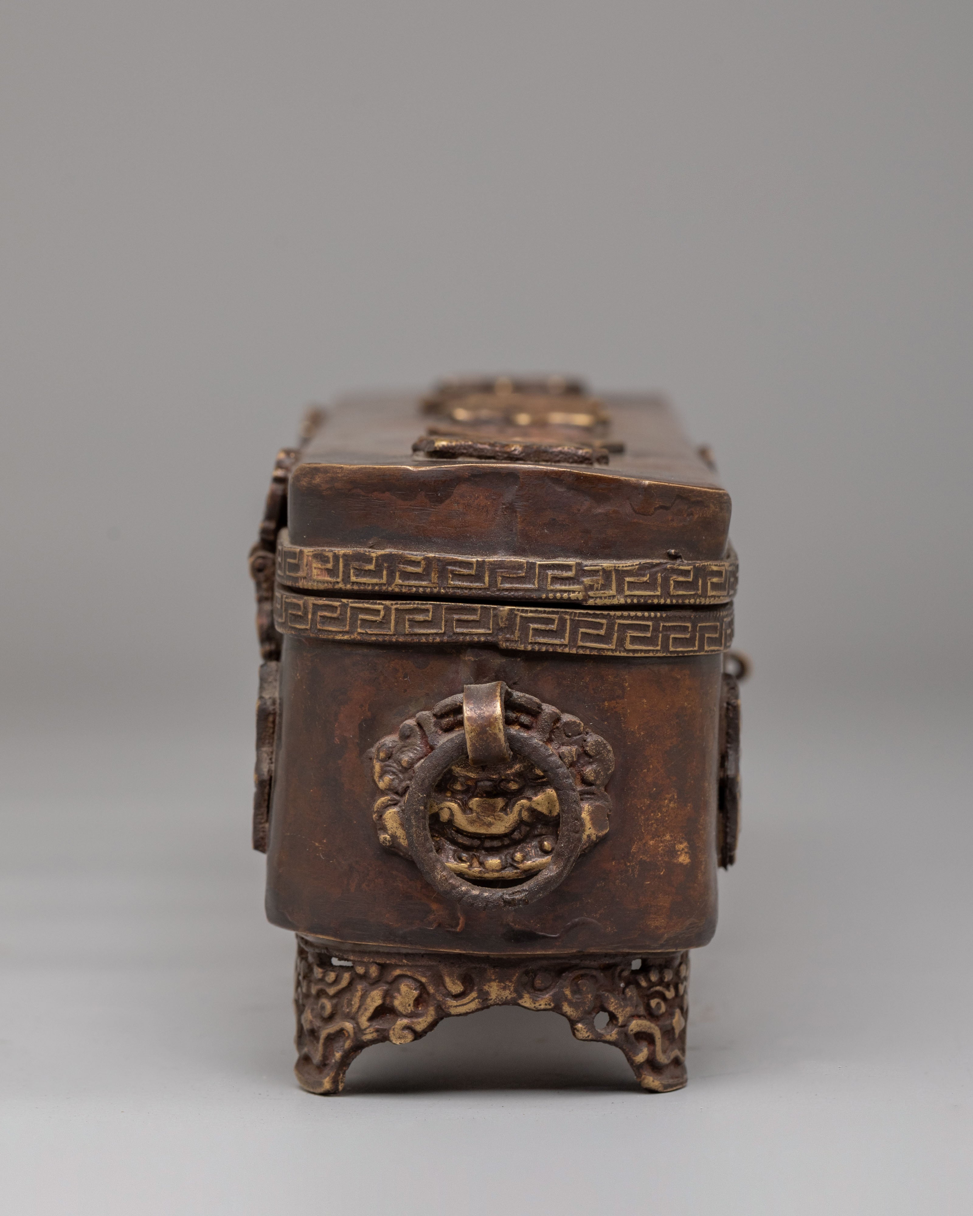 The design features detailed embossed motifs inspired by Tibetan symbolism, often associated with protection, purification, and auspicious energy. Decorative patterns flow along the surface, highlighting the skill of traditional metalwork and the cultural depth behind the piece. The hinged structure allows easy placement and removal of incense while maintaining a clean, organized altar setting that honors ritual order and intention.