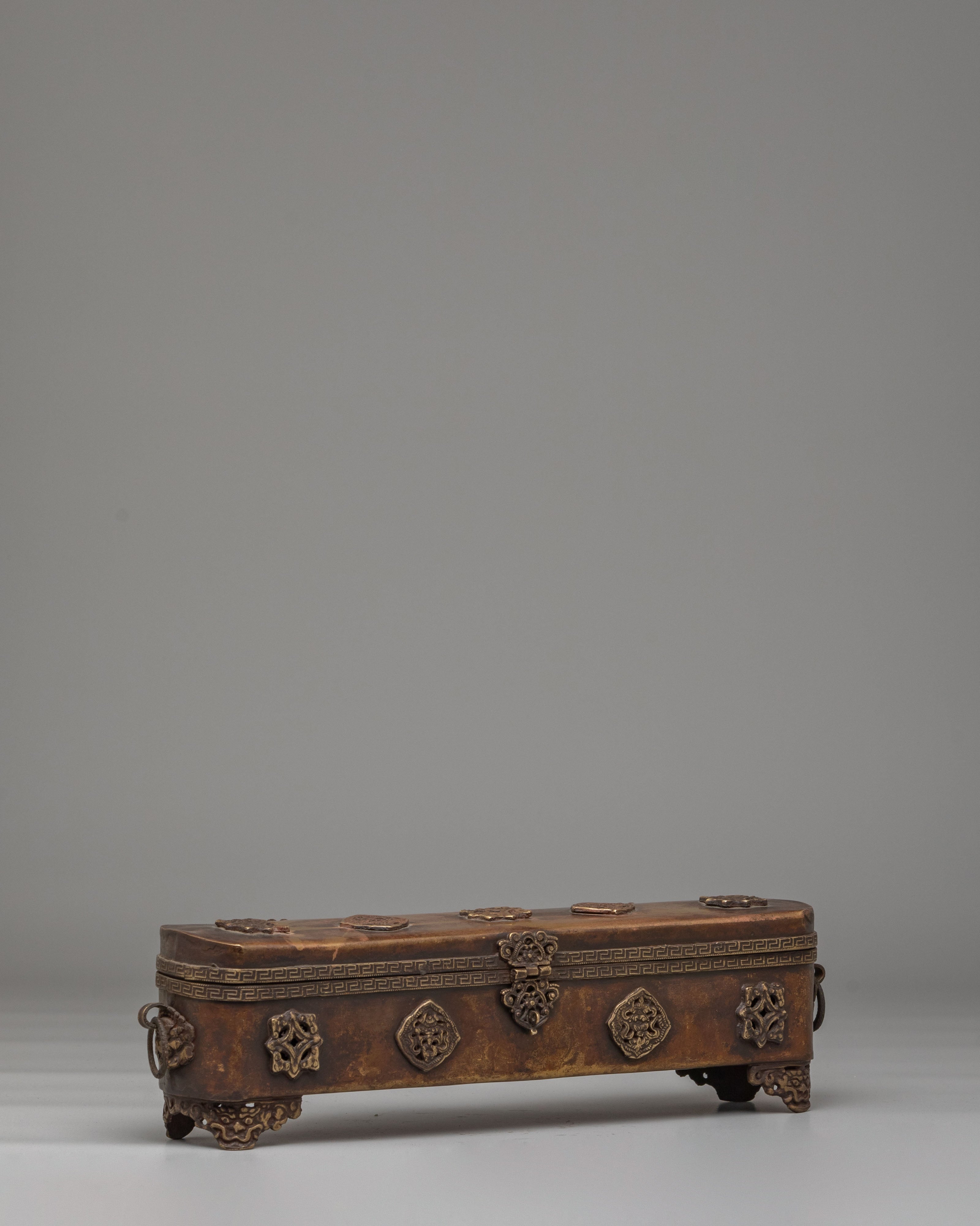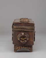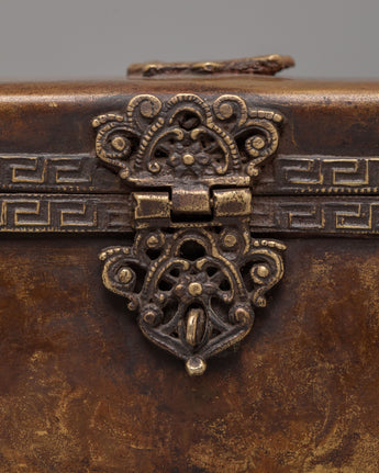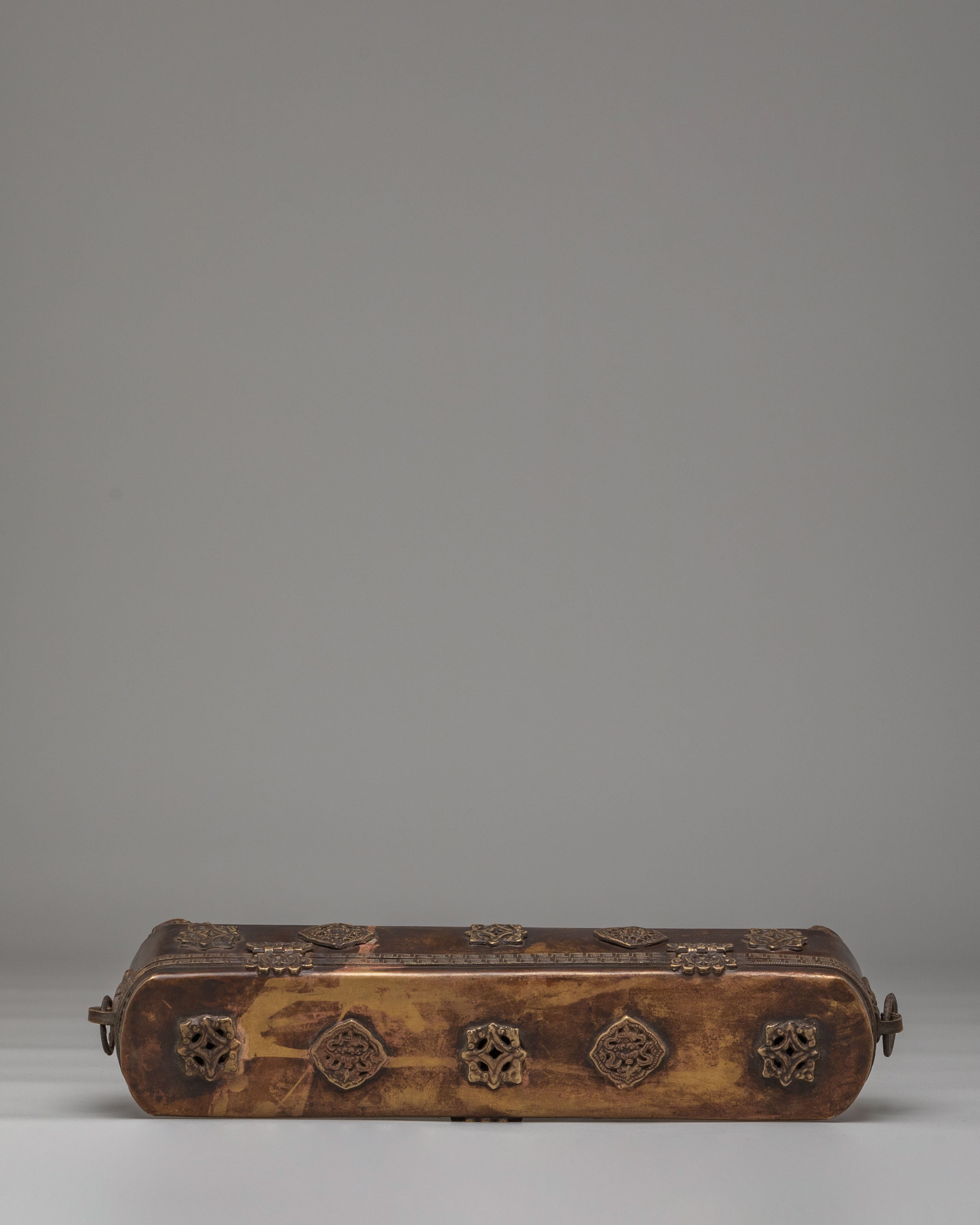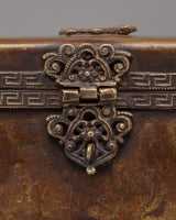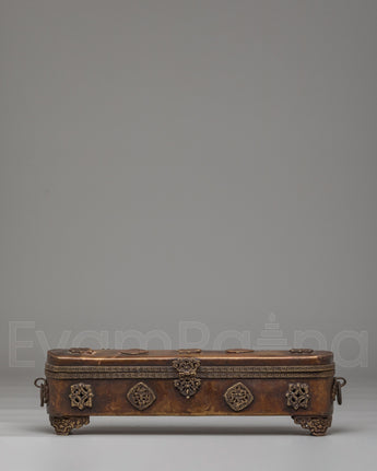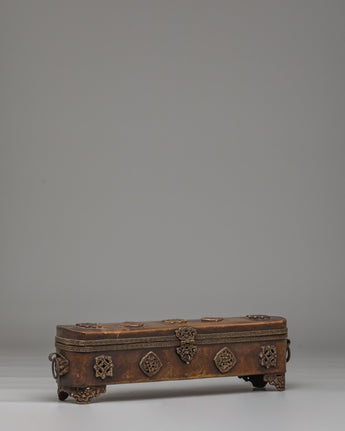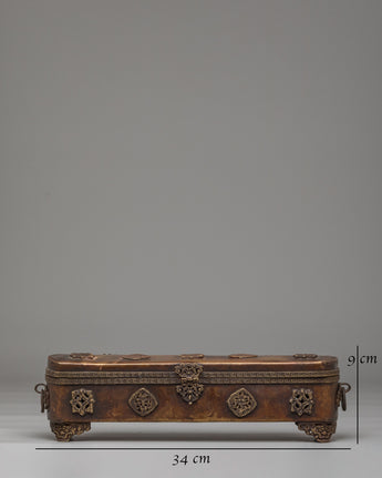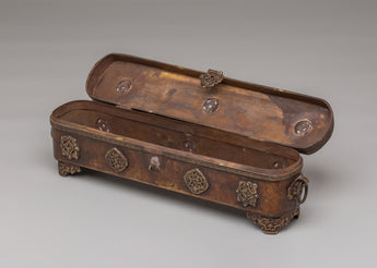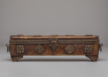 This traditional Tibetan incense box is a refined ritual accessory used for storing incense sticks and sacred materials in Buddhist practice. Handcrafted from a copper body, it reflects the spiritual heritage of Himalayan craftsmanship while adding an authentic presence to meditation spaces and home altars. Its elongated form and warm metallic tone make it both visually striking and spiritually meaningful, ideal for practitioners and collectors of Buddhist ritual art.