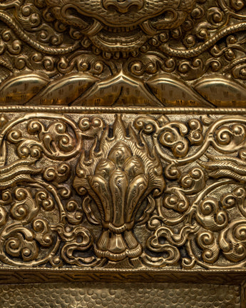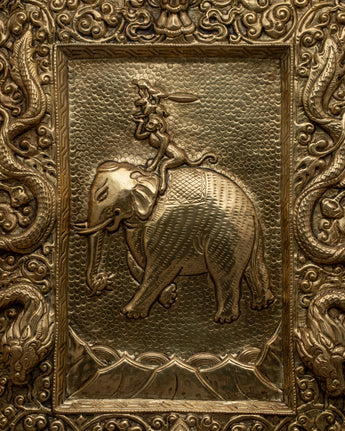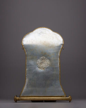 A metal thangka is a type of thangka painting that is made on a metal surface rather than on traditional canvas or paper. Metal thangkas are often made using copper, brass, or silver and are usually decorated with intricate designs and Buddhist iconography using a technique called repoussé. This involves hammering the metal from the reverse side to create a raised relief image on the front. Metal thangkas are known for their durability and are often used in ritual contexts or as decorative pieces in Buddhist homes and temples. They are particularly common in Tibet, where they have been produced for centuries.
