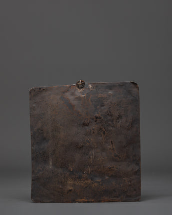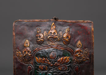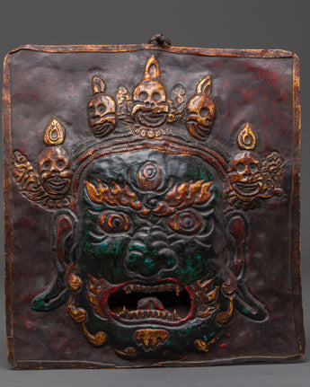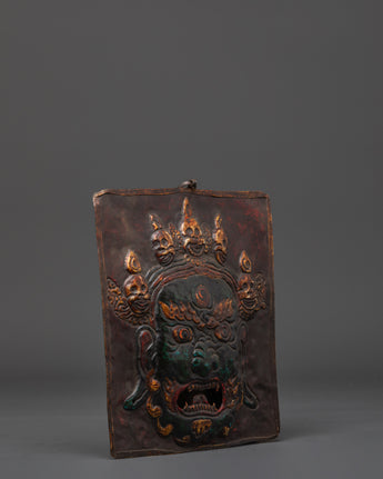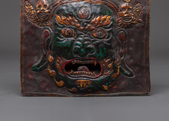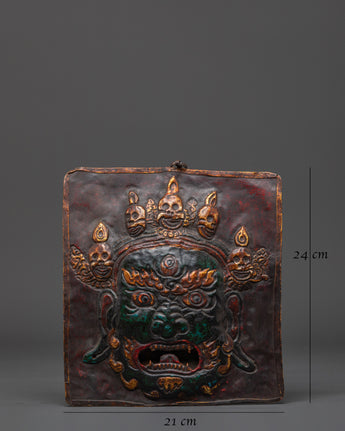 Handcrafted by expert artisans, this Mahakala head art reflects Mahakala's furious visage, with the skull crown expressing the fleeting nature of existence and the power to banish darkness. The brass material showcases the design's superb workmanship, giving it an eye-catching addition to your Buddhist decor. The Mahakala deity's keen stare and symbolic skull crown make this wall hanging a powerful statement piece for individuals on a spiritual journey.