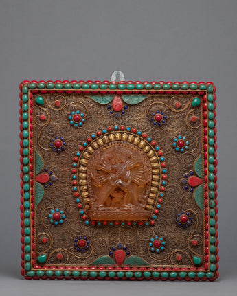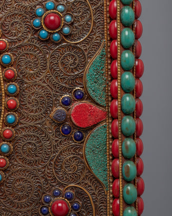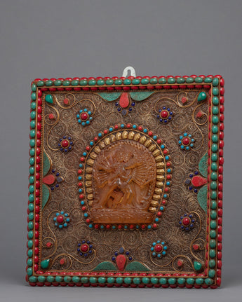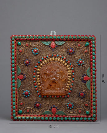 The Chakrasamvara Thangka is a wonderful piece of handcrafted art with a copper body. The statue is carved with a crystal stone in the middle, and gemstones are embedded on the board, giving it a stunning and bright appearance. The Chakrasamvara god is one of Buddhism's most renowned and powerful deities, and this statue brilliantly reflects its essence and force. The elaborate features and skilled craftsmanship make this statue a wonderful addition to any collection or altar, while Chakrasamvara's symbolic portrayal promotes serenity, wealth, and spiritual progress.