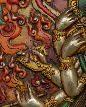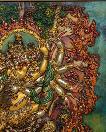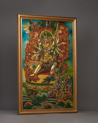 A beautiful work of spiritual art, the Chakrasamvara Wall Hanging Thanka is carefully created by hand and on a durable wooden frame. The thanka uses poster colors, wood powder, emboss, and marble painting processes to create detailed, colorful details. The artwork is brought to life by the exquisite accuracy and vibrant colors used to depict the deity Chakrasamvara, who represents the confluence of wisdom and compassion.