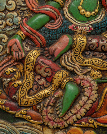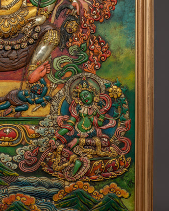 This thanka is a practical meditation tool and a gorgeous item. It elevates any sacred area or personal altar with its elaborate decorations and vivid graphics that captivate the spectator. The artwork gains depth and authenticity from the traditional methods and materials employed to protect cultural heritage.