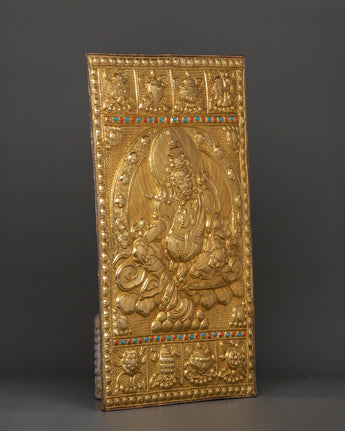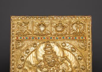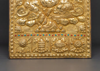 This Dzambhala Metal Thangka is a fantastic work of sacred Tibetan artwork designed to bring prosperity and fortune into your home. The thangka's brass body is meticulously crafted, with the renowned Dzambhala, the Tibetan prosperity deity, in the center. Standing 59.5 cm tall, 39 cm wide, and weighing 2.69 kg, this artwork is ideal for any altar, meditation room, or spiritual place, generating an environment of richness and good energy. The elaborate design and vibrant accents make it more than a spiritual item; it's also a stunning decorative addition for your house.