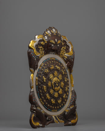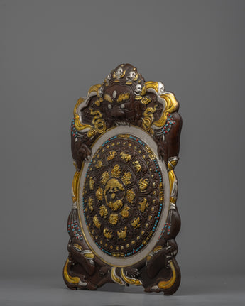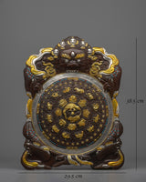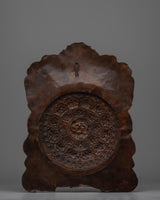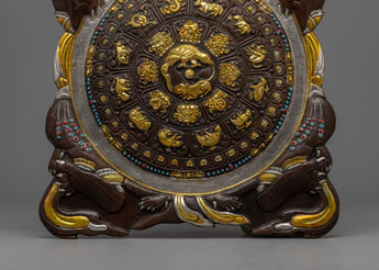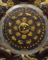 The Eight Auspicious Symbol Wall Hanging is made of oxidized copper and finished with electro gold and silver plating. This artwork, which measures 38.5 cm in height by 29.5 cm in breadth and weighs 0.72 kg, combines stunning artistry with spiritual significance. The contrasting tones of gold and silver provide an elegant finish, making it a stunning complement to any religious or meditation setting.