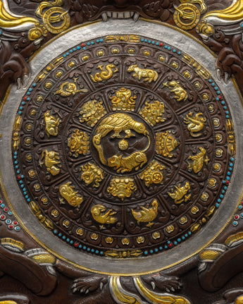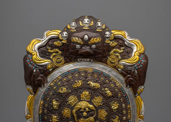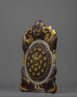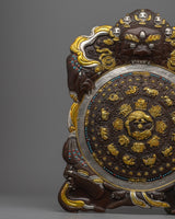 The mandala of the Eight Auspicious Symbols (Ashtamangala) is in the middle, with the parasol, golden fish, treasure vase, lotus, conch shell, unending knot, victory banner, and wheel of Dharma representing blessings such as protection, wisdom, prosperity, and harmony. Surrounding this sacred mandala are powerful Dharmapala figures that serve as divine guardians, preserving the holiness and energy of these fortunate symbols. The Dharmapala's protective presence highlights the significance of protecting spiritual values and ensuring that benefits flow unhindered by bad influences. This wall hanging functions as both a reminder of life's holy potential and a protective charm, promoting calm, wealth, and well-being.