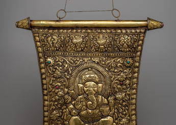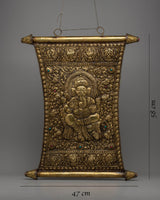 Embrace the divine presence with our handcrafted Brass Ganesh Metal Wall Hanging Thangka. Standing at 58cm, this Thangka is a symbol of wisdom and prosperity, as represented by Lord Ganesh, who is revered in many spiritual traditions.