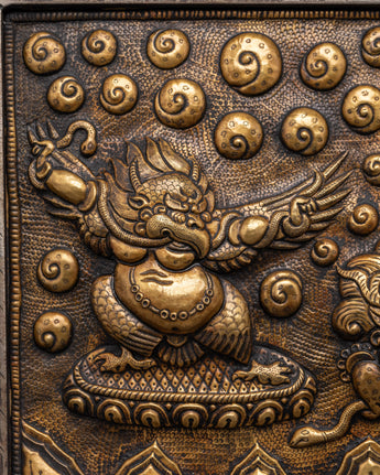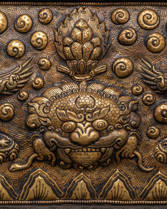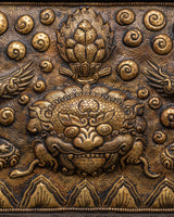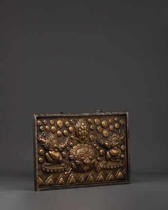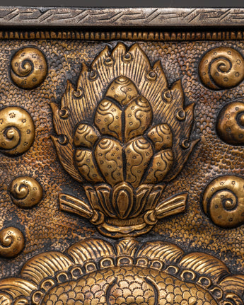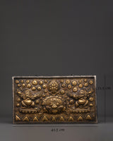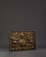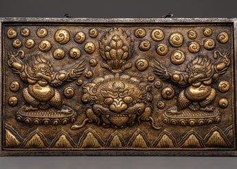 With its exquisite carvings and holy patterns, the brass body exudes a profound spiritual quality and superb craftsmanship. It is a decorative and significant item due to the strength and contrast of the iron framework. This wall hanging's hefty weight of 2.01 kg highlights its presence and craftsmanship. This Tibetan brass wall décor has a strong effect, whether you're decorating a yoga studio or creating a calm household atmosphere. This Handcrafted Tibetan wall hanging promotes mindfulness and cultural awareness, making it an ideal accent for a Zen space, a spiritual gift, or a focal point in your home. Use this genuine item to infuse your interior spaces with a depth of mystery and sacred energy.
