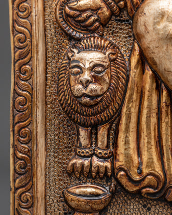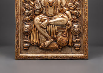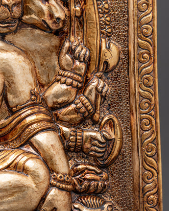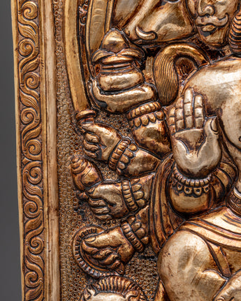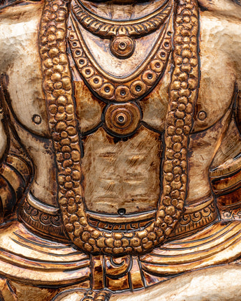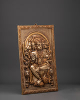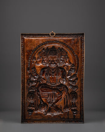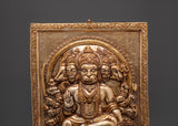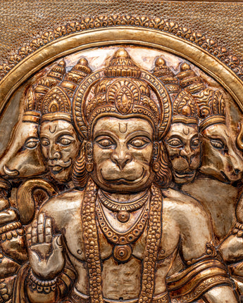 Measuring 48cm in height and 33cm in width, and weighing 1.32kg, this substantial wall hanging is handcrafted from copper and adorned with a radiant combination of gold and silver plating. The detailed engraving showcases Hanuman in a divine, multi-faced, each face representing a different cosmic aspect of divine presence. The textures and polished accents bring the piece to life, radiating energy and artistic precision rooted in traditional craftsmanship.