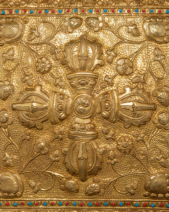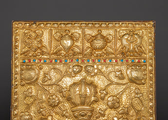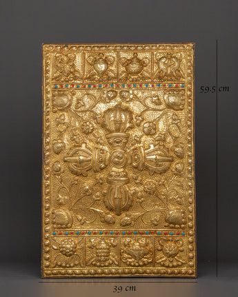 This Himalayan Metal Thangka is a stunning work of spiritual art, precisely handmade to highlight the strong Bhiswo Vajra, which is flanked by eight auspicious symbols and delicate flower designs. This gorgeous wall hanging, measuring 59.5 cm in height and 39 cm in width and weighing 2.70 kg, is constructed of brass with a deep, golden tint highlighting its elaborate workmanship. The centerpiece, the Bhiswo Vajra, represents unwavering strength and spiritual power. In contrast, the eight auspicious symbols, the Endless Knot, Conch Shell, Victory Banner, Dharma Wheel, Treasure Vase, Lotus Flower, Parasol, and Golden Fish, represent protection, prosperity, purity, and spiritual blessings. The delicate floral engravings provide a beautiful touch, evoking the harmony of nature and spirit.
