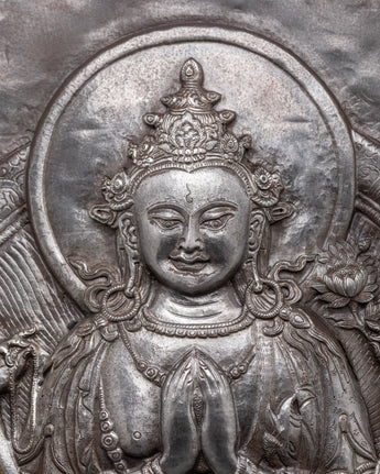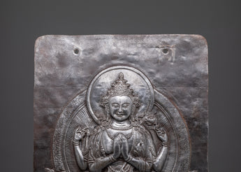 Discover the peaceful presence of compassion with this expertly created Iron Chenrezig Wall Hanging, which brings the powerful spirit of Chenrezig, the Bodhisattva of Compassion, into your sacred area. This wall decor piece, measuring 41.5 cm in height and 30.5 cm in width, is entirely crafted of iron, ensuring strength while keeping intricate workmanship. Its moderate weight of 0.94 kg makes it suitable for hanging in any room or meditation space.