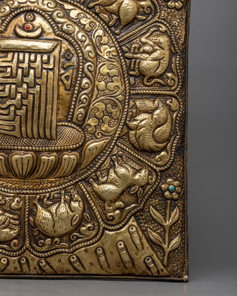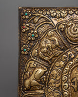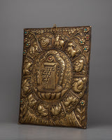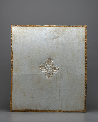 A metal thangka is a type of thangka painting that is made on a metal surface rather than on traditional canvas or paper. Metal thangkas are often made using copper, brass, or silver and are usually decorated with intricate designs and Buddhist iconography using a technique called repoussé. This involves hammering the metal from the reverse side to create a raised relief image on the front. Metal thangkas are known for their durability and are often used in ritual contexts or as decorative pieces in Buddhist homes and temples. They are particularly common in Tibet, where they have been produced for centuries.