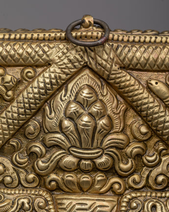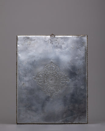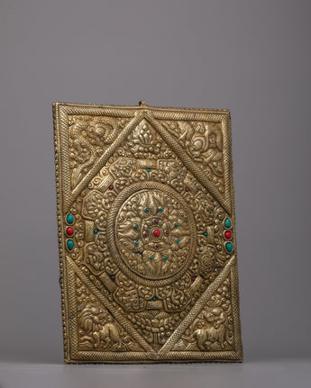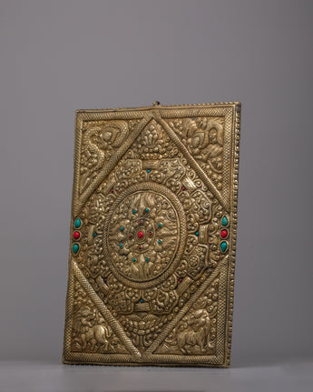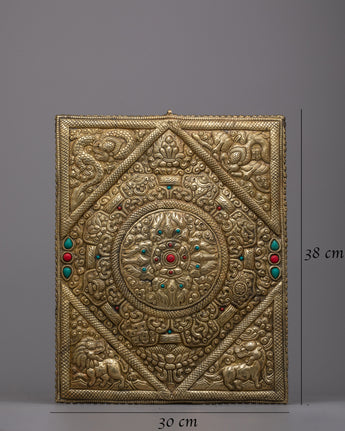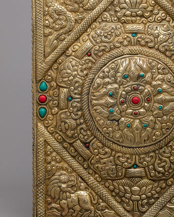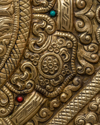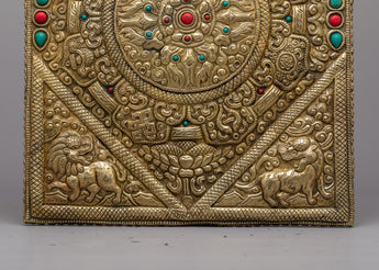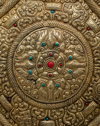 The mesmerizing Mandala Metal Wall Art will provide a magical touch to any room. It is expertly created on a brass body and is embellished with vivid turquoise and coral stones. This magnificent item, which is 38 cm tall and 30 cm wide, is 1.91 kg in weight and has a wonderfully carved Vishwo Vajra motif along with other fortunate symbols.